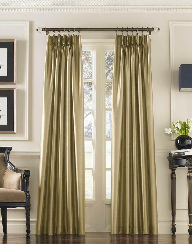 - Lined faux silk fabric with subtle shimmer and pinch-pleat construction