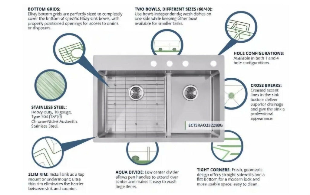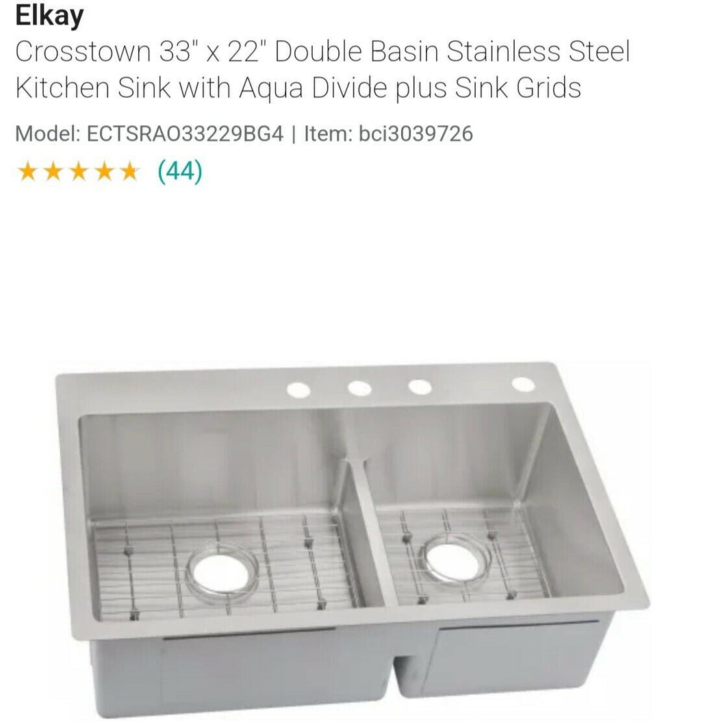 This Elkay ECTSRAO33229BG Crosstown sink is a high-quality addition to any kitchen. With a stainless steel material and a finish of 4 faucet holes, this sink is both durable and functional. Measuring at 33 inches in length, 22 inches in width, and 9 inches in height, it features a double basin design and is compatible with 4 faucet holes.
