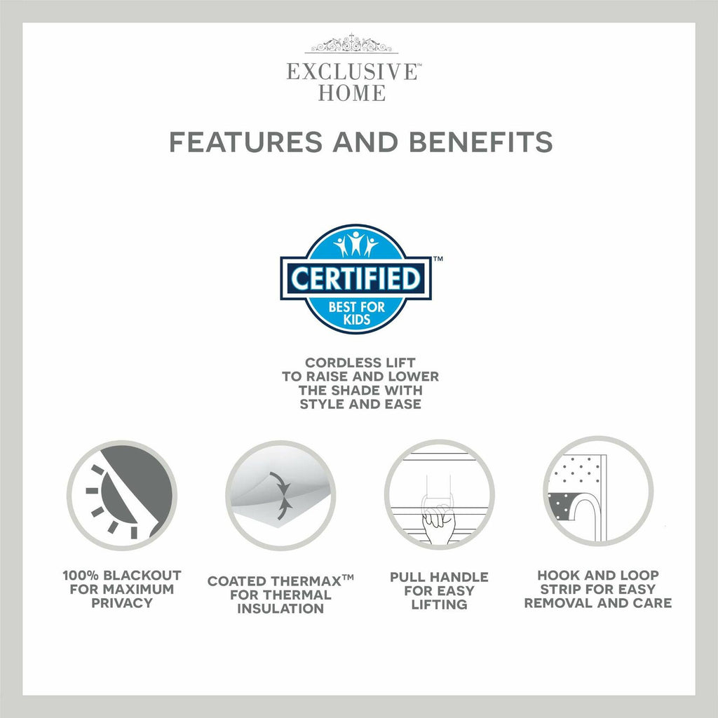 - CORDLESS SHADE: The Exclusive Home Acadia Total Blackout Roman Shade has a sophisticated, linen look. It's cordless with a foam back and a handle for pulling up and down. Set includes 1 shade, 1 rail, 2 brackets, 4 screws, 4 anchors.