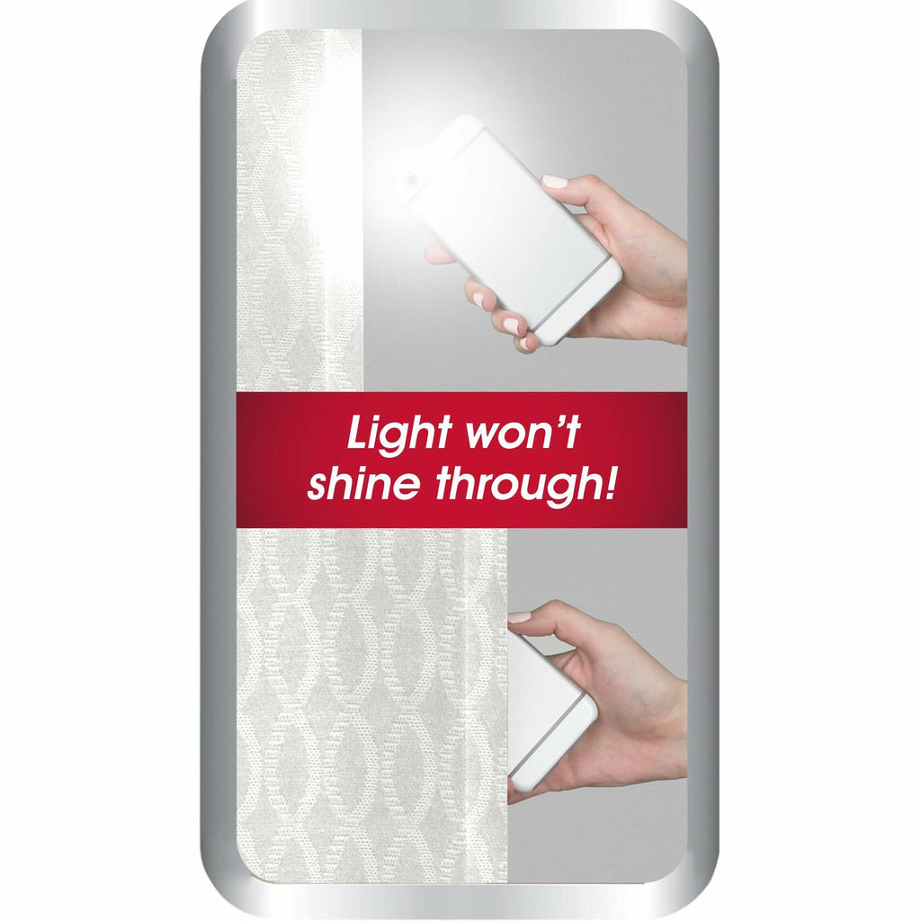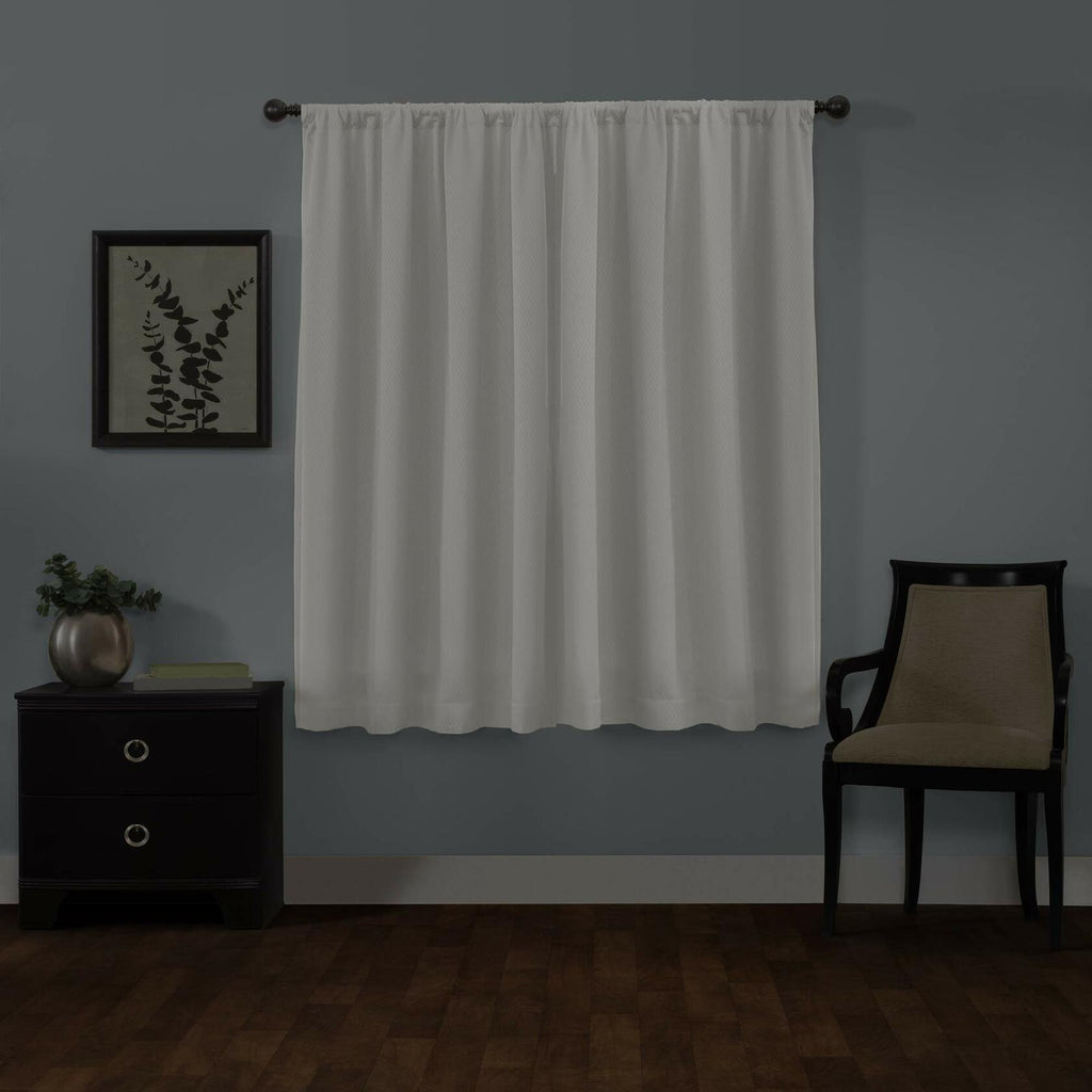 Block out harsh, glaring sunlight in any room with the Certified 100% Blackout Jamie Smart Curtain. Eliminate 100 percent of light for optimal comfort in living rooms, bedrooms, nurseries and more. Featuring an interlocking geometric design on solid, textured Jacquard fabric with a rod pocket top. The Blackout Curtain is machine washable for easy care. Includes 1 panel per package and measures 50 inches x 84 inches.