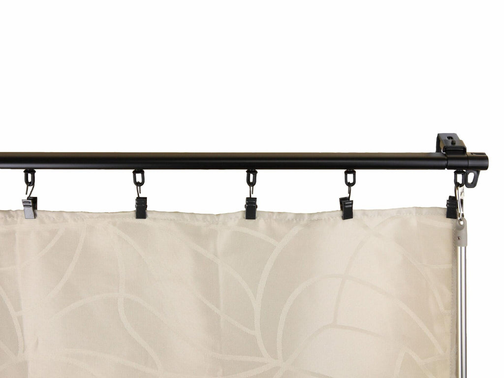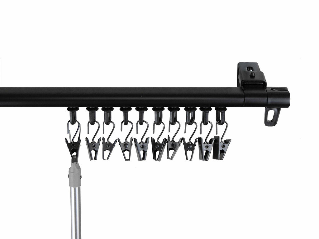 - Includes one 48-84 inch adjustable track with 20 sliders, 20 hooks with clips, 4 adjustable wall brackets, 1 baton and mounting hardware