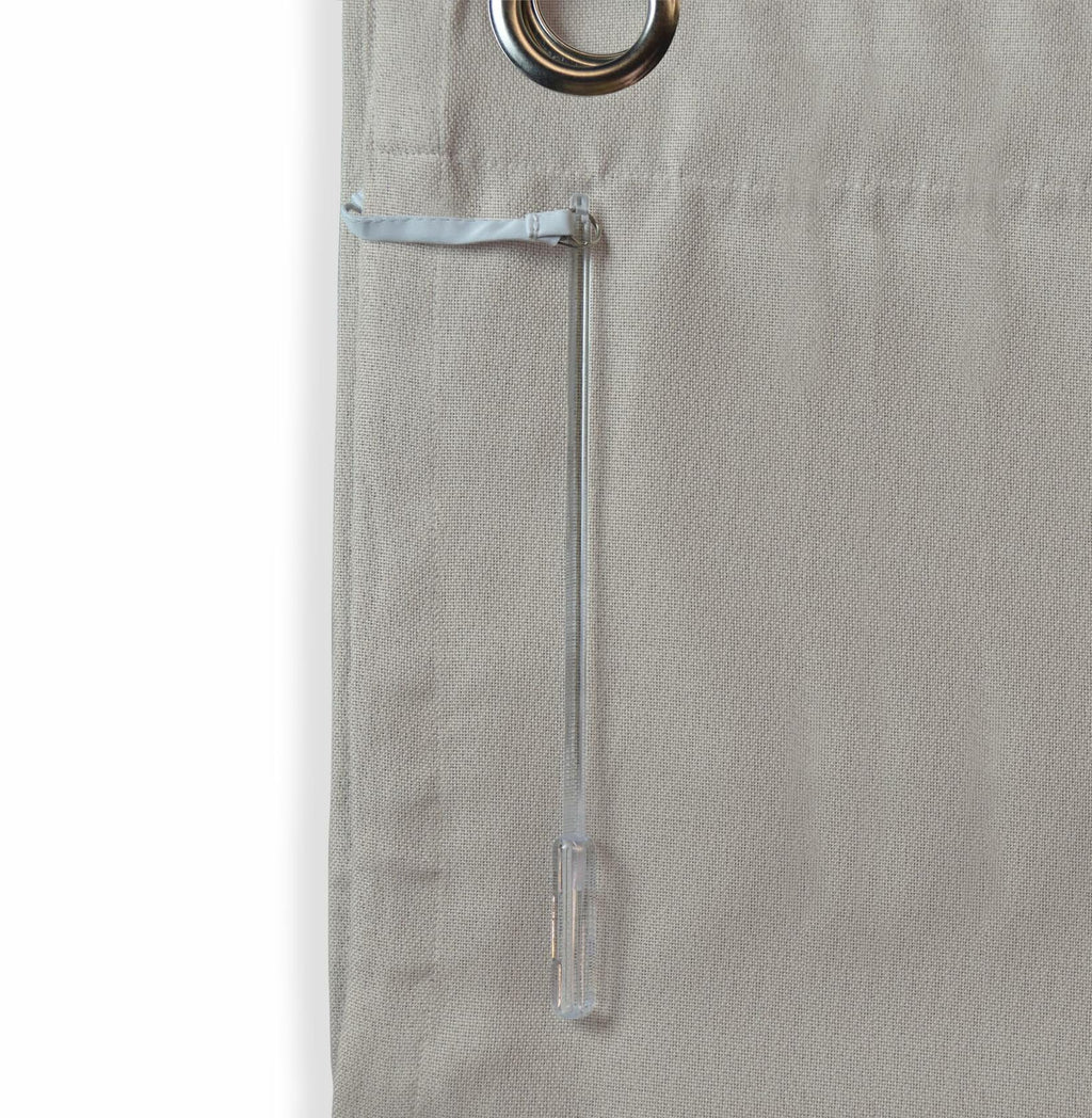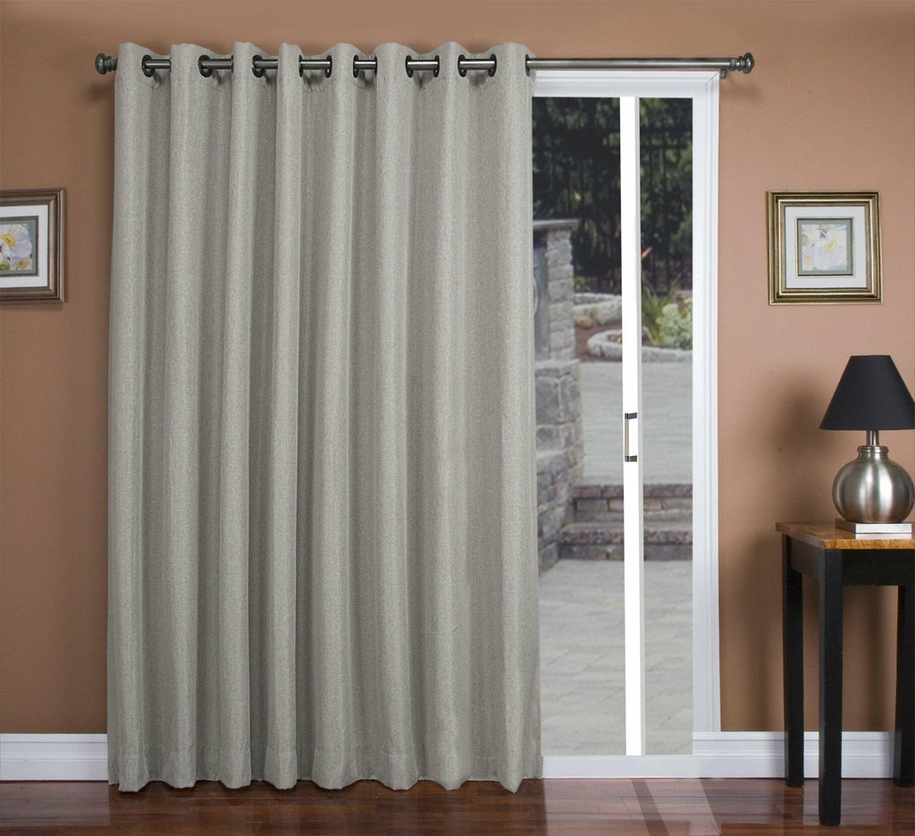 Tacoma: this grommet-top curtain patio panel is a casual but sophisticated, separately lined, super insulating, double blackout curtain! both the face fabric and the separate lining are woven with blackout yarns. This fabric effectively stops light and heat from penetrating through the density of its construction, which subtly integrates black yarn into the pattern of colored yarns. The dual layers of textured, canvas-like blackout face fabric and heavy-weight, soft gray blackout lining create an air barrier that provides the ultimate in energy savings, noise reduction and room-darkening qualities. With a custom-level 4” bottom hem and weighted corners, this curtain panel drapes elegantly and compliments any room decor. This panel is an extra wide 106”, making it perfect for patio sliders and extra wide windows. A detachable pull wand can be positioned on either side for easy opening and closing. Each curtain panel has 16 grommets (1.5” inside diameter). both face fabric and lining are easy-to-care-for, 100Percent polyester: machine washable. Tumble dry low. Imported. Available in 5 colors: Stone with brushed nickel grommets, parchment with brushed nickel grommets, Woodland green with antique bronze grommets, driftwood with antique bronze grommets, and floral rose with antique bronze grommets. Available in 84 inch length.